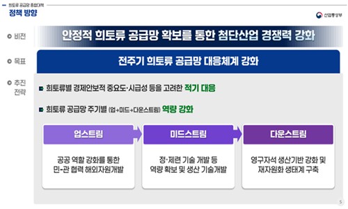 그동안 우리나라는 희토류 공급망 확보에 대응하긴 했지만, 다운스트림(영구자석 제조) 육성에 치우친 경향이 있었다. 이에 이번엔 '업(자원개발)-미드(분리정제)-다운스트림'으로 이어지는 전 주기 공급망 구축에 집중하기로 했다.