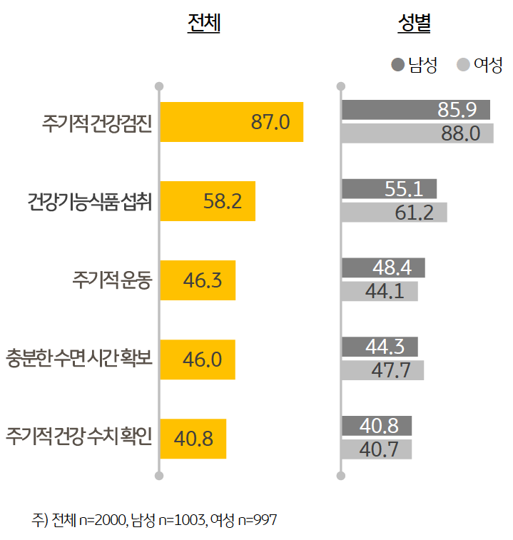 통계청의 ‘사회조사’에 따르면, 주관적 건강상태, 즉 스스로 건강하다고 생각하는 사람 비율은 2022년 53.1%로 절반이 넘는 국민이 질병 여부와 관계없이 주관적으로 건강하다고 인식하고 있다.이 비율은 2012년 45.3%에서 2016년 47.1%, 2020년 50.4%로 꾸준히 증가해 왔다.