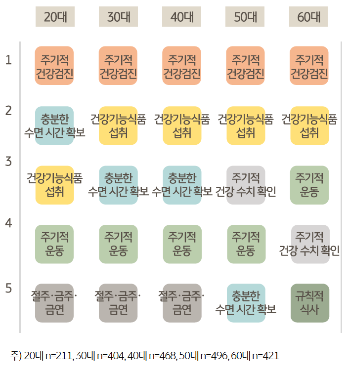전반부 첫 번째 장인 본 장에서는 ‘몸’과 ‘마음’ 건강관리 실태에 관해 구체적으로 들여다보기에 앞서 ‘건강 일반’에 대한 종합적인 인식과 관리 수준을 중점적으로 살펴보았다. 실제나이, 체감 건강나이, 노화시작나이 등 다양한 나이에 대한 인식을 시작으로 건강관리의 관심 분야와 걱정거리, 우려 수준을 짚어보고 마지막으로 건강관리를 위한 행동 유형을 알아보고자 한다.