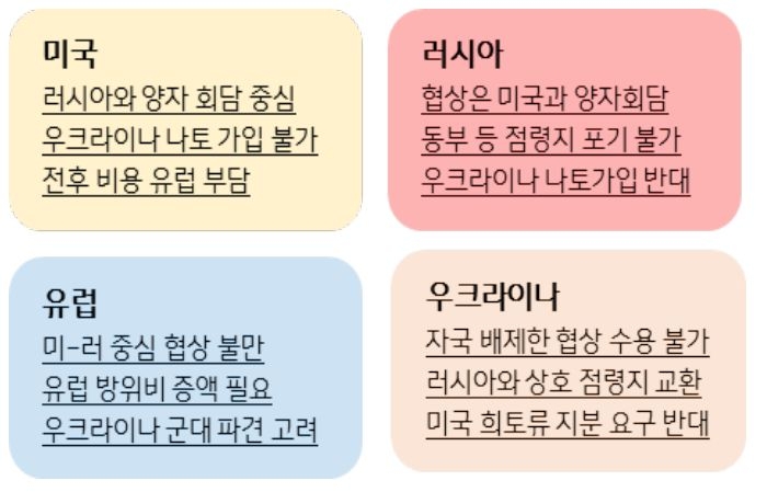 2월 12일 미국 트럼프 대통령은 러시아 푸틴 대통령과 전화 통화를 통해 ‘종전 협상 개시’를 발표했고, 이후 미 국무장관의 사우디 방문, 장관급 종전 협상 등이 시작되었다. 2월 말 또는 3월 초에는 미-러 정상회담이 예상되며, 이르면 4월 초에 러-우 휴전이 가능할 것으로 예상된다.