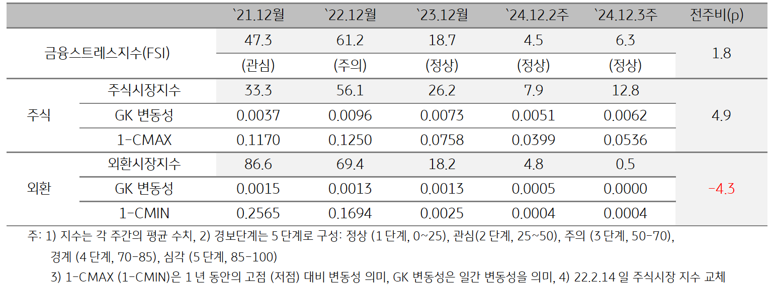 - 2024년 12월 3주차 (2024년 12월 9일 ~ 12월 15일) 금융스트레스지수 (37.0)은 전주대비 9.2p 하락