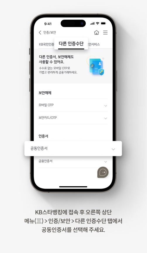 | 1 | KB스타뱅킹에 접속 후 오른쪽 상단 메뉴(☰) > 인증/보안 > 다른 인증서/보안매체 아래 '인증서'를 눌러 주세요. |
