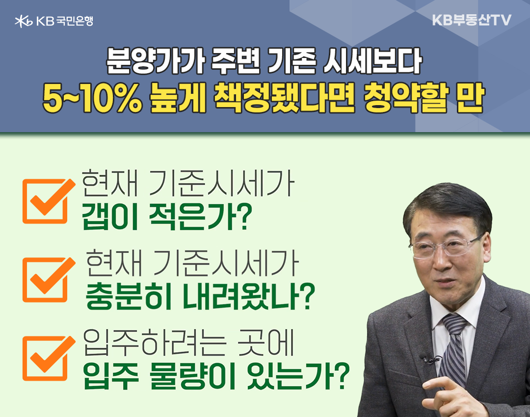 그러나 해당 지역에 입주 물량이 많이 대기하고 있다면 앞으로 가격은 더 내려갈 가능성이 있습니다. 따라서 현재 시세가 충분히 내려왔는지, 분양가가 기존 시세와 차이가 적은지, 해당 지역에 입주 대기 물량이 있는지 이 세가지를 체크해보라고 권고했습니다.