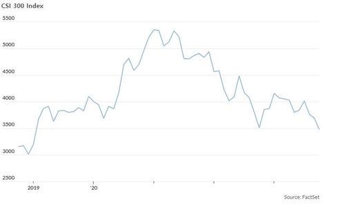 팩트셋 데이터에 따르면 상하이·선전 증시 시가총액 상위 300개 종목으로 이뤄진 중국 CSI 300 지수는 전일 1% 이상 하락해 3,474.47에서 마감했다. 이는 2019년 2월 21일 이후 가장 낮은 종가다.