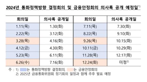 한은은 26일 2024년 중 금통위 정기회의 개최 및 의사록 공개 예정 일정을 공표했다.