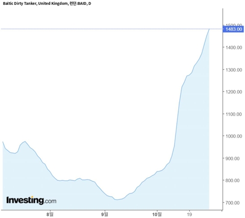 원유 유조선 운임지수(BDTI)는 9월 초만해도 700대 초반이었다가 10월부터 급격히 오르기 시작해 지난달 말 기준 1천483을 나타냈다.