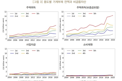 저자는 또 "연구는 비금융자산 취득 용도의 신규 가계부채가 발생할 경우 저소득 가계에는 소득이 감소하는 반면 고소득 가계는 소득이 증가하는 효과가 있다는 점을 밝히고 있다"면서 "과도한 가계부채가 재분배 측면에서 부정적 효과를 야기할 수 있음을 의미한다"고 우려했다.