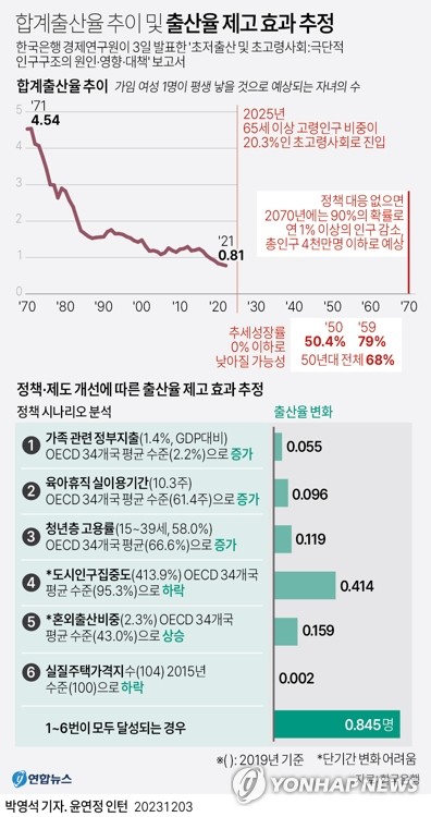(서울=연합인포맥스) 미국 뉴욕타임스(NYT)가 0.78명인 대한민국의 합계 출산율을 거론하면서 1.8명인 북한이 어느 시점에선가 남침할 가능성이 있다고 꼬집었다. 외부의 우발적 시각으로 볼 수도 있지만 정확한 수치에서 오는 날카로움을 꺾을만한 마땅한 대거리는 없다. 선진국 모임이라는 경제협력개발기구(OECD) 회원국 중 최저, 전 세계 217개 국가와 지역을 통틀어도 홍콩(0.77명) 제외시 가장 낮다. 전 세계 평균 출산율은 2.3명, 인구 대체 수준은 2.1명이며 OECD 평균은 1.58명이라고 한다.