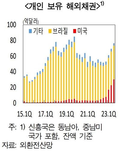 한은에 따르면 개인이 올해 9월까지 미국 채권을 22억4천만 달러 샀다. 미국 채권 금리 하락에 따른 자본이득 등을 기대한 영향이라고 한은은 설명했다.