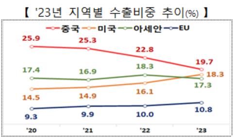 지난해 중국은 우리나라의 최대 수출국이었으나 수출액은 19.9% 감소한 1천248억4천만달러였고 아세안으로의 수출(1천92억4천만달러)도 12.5% 줄었다.