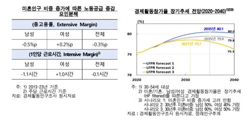 아울러 미혼인구 비중 증가세가 지속될 경우 경제활동참가율 장기추세의 정점 시점이 당겨지고 정점 수준은 낮아지며 정점 이후 감소 속도는 가팔라지게 되는 것으로 분석됐다.