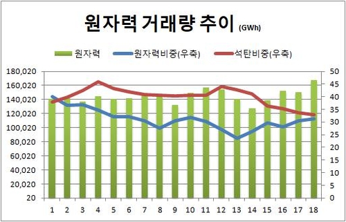 (세종=연합인포맥스) 이효지 기자 = 지난해 원전 전력거래량 비중이 석탄 비중에 맞먹는 수준으로 확대됐다.