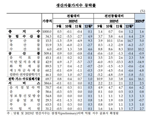 (서울=연합인포맥스) 윤은별 기자 = 지난해 12월 생산자물가지수가 3개월 만에 상승 전환했다.