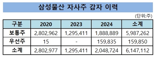 (서울=연합인포맥스) 유수진 기자 = 삼성물산이 1조원 규모의 자기회사 주식(자사주)을 소각한다. 지난해 2월 발표한 '차기 3개년(2023~2025년) 주주환원 정책'의 일환이다.