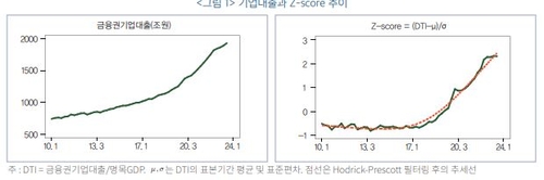 금융연구원에 따르면 기업대출을 GDP로 나눈 비율이 장기적인 평균치에서 얼마나 이탈했는지를 보여주는 Z-score가 있습니다. 일종의 신용위험 지표인데요. 이 수치가 지난 2018~2019년부터 가파르게 상승하고 있는 것을 확인할 수 있습니다. 즉, 경제가 성장하는 속도에 비해 기업들의 채무 부담이 그동안의 장기적인 평균치를 크게 벗어나는 속도로 빠르게 늘어나고 있다는 이야기입니다.