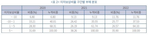 이자보상비율이 -10 이하인 기업, 그러니깐 부실의 정도가 최악이라고 할 수 있는 기업의 부채가 전체 부채에서 차지하는 비중은 2020년 약 7%에서 2022년 12%로 크게 높아졌습니다. 보통 이자보상비율이 1 이하인 경우에는 자산 매각이나 유상 증자를 통해 부채를 축소할 필요가 있다고 보는데요. 이 비율이 -10 이하라면 소위 말하는 좀비기업이라고 할 수 있을 정도로 굉장히 부실한 기업이라고 할 수 있습니다.