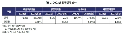 한기평이 분석한 16개 건설사 작년 합산 매출은 13.8% 증가한 87조7천억원이었으나, 시멘트·레미콘 가격 상승, 높은 인건비 등 인플레이션의 여파가 지속돼 영업이익률은 전년 대비 2.5%포인트(P) 하락한 2%를 기록했다.