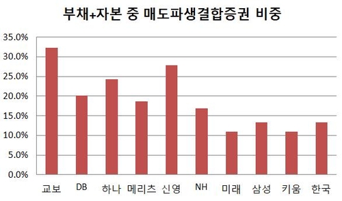 지난해 3분기 기준 증권사 중 부채·자본총계 대비 ELS 등의 매도파생결합증권 비중이 높은 증권사는 교보(32.4%), DB금융투자(20.2%), 메리츠(18.7%), 신영(27.8%), 하나증권(24.3%) 등이다.