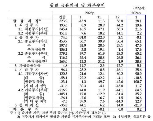 한은은 "반도체 관련주를 중심으로 주식 투자 순매수가 지속됐고 채권 투자는 연초 신규 투자 재개 등의 요인"이라고 설명했다.