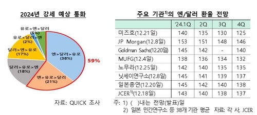 한국은행 동경사무소는 "미국의 정책금리 인하 기대가 커지는 최근의 상황을 감안할 때 내년 엔-달러 환율은 사실상 미국의 금리 인하 시기에 연동돼 움직일 가능성이 있다"며 "미국이 정책금리를 인하해 미·일간 금리차가 축소되면 엔화강세로의 전환이 본격화할 전망이며, 외환시장 참가자 절반 이상은 올해 주요 통화 중 엔화가 가장 강세를 보일 것으로 본다"고 말했다.