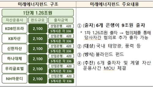 미래에너지펀드는 1차로 1조2천600억원 규모의 펀드를 조성하고, 6개 출자 은행으로 구성된 협의체를 통해 필요시 추가 출자할 예정이다.