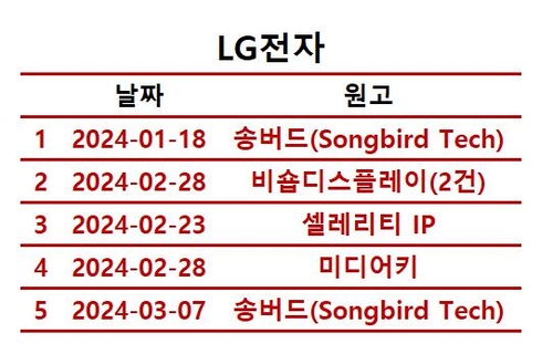 19일 연합인포맥스가 지난달 삼성전자와 LG전자를 상대로 미국에서 제기된 특허 소송을 취합한 결과, 각각 8건과 4건에 이르렀다. 삼성전자는 나흘에 한 번, LG전자는 일주일에 한 번꼴로 소송을 당한 셈이다.
