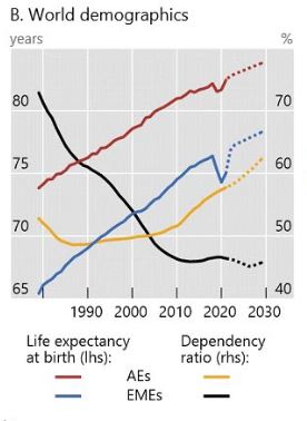 세계적으로 기대 수명은 팬데믹 기간 잠시 하락했지만, 그 이후로 선진국이나 신흥국 모두 계속해서 증가하는 것을 수치상으로 확인할 수 있습니다.