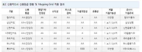 다만 지난해 말에는 NICE신용평가, 지난 20일에는 한국신용평가가 현대카드의 신용등급 전망을 'AA(안정적)'에서 'AA(긍정적)'으로 상향 조정했다. 신용등급 하향의 원인이던 모기업 현대자동차와 기아의 등급이 상향 조정될 가능성이 반영됐기 때문이다.