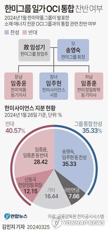 (서울=연합인포맥스) 김학성 기자 = 오는 28일 한미사이언스[008930] 정기주주총회를 앞두고 한미그룹 경영권을 둘러싼 오너일가 모녀와 형제의 분쟁이 절정으로 치닫고 있다.