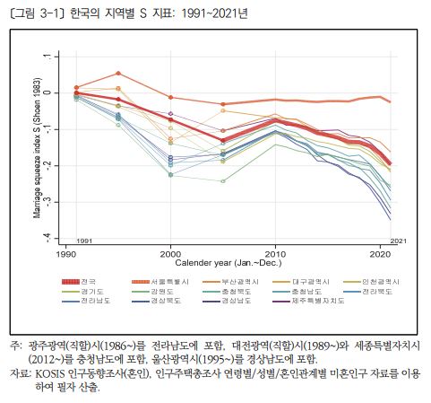 특히 S지표에 따르면 우리나라의 지역별 특성도 한눈에 확인할 수 있는데요. 서울의 경우에는 결혼 성비가 크게 문제가 되지 않는 상황입니다. 하지만 지방은 남성이 결혼하기가 매우 어려운 구조인 것으로 나타났는데요. 특히, 광역시를 제외한 도 지역이 매우 악화하여 있는 것을 알 수 있었습니다.