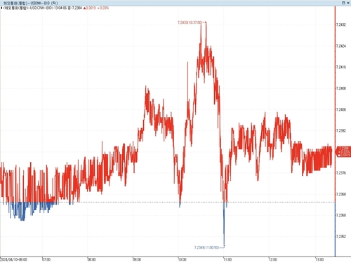 다만, 이러한 소식에도 역외 달러-위안(CNH) 환율은 동요하지 않았다. 우리나라 시간으로 오후 1시 1분 현재 전일 대비 0.02% 정도 오른 7.2383위안 부근에서 횡보 중이다.