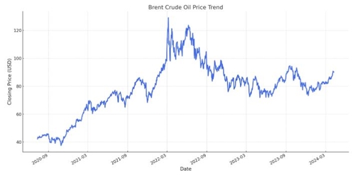 북해산 브렌트유의 가격 흐름을 보면요. 러시아 침공 직후인 2022년 3월 초순 한때 배럴당 138달러까지도 올랐으나 점차 안정되며 침공 이전인 2022년 초순 수준으로 유가가 안정되는 것을 볼 수 있습니다.