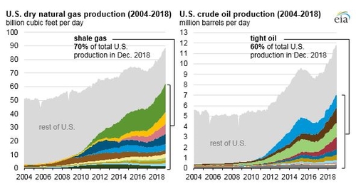 왼쪽 그래프는 미국 천연가스 생산량이 늘어나는 가운데 셰일 가스의 비중이 70%에 달한다는 것을 보여주고요. 오른쪽 그래프는 미국의 석유 생산량이 늘어나는 가운데 셰일 오일(타이트 오일이라고도 불림)의 비중이 60%에 달한다는 것을 보여주고 있습니다.