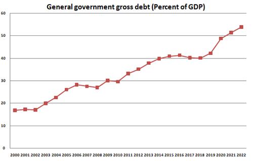IMF에 따르면 2022년 기준 지난 10년간 국내총생산(GDP) 대비 공공부채 비율은 35.00%에서 53.80%로 54% 상승했다.
