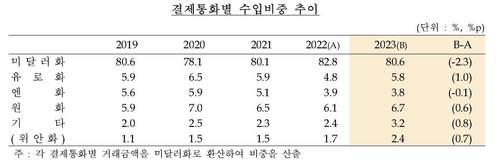 반면 유로화 수입 비중은 5.8%로 1.0%포인트, 위안화는 2.4%로 0.7%포인트 각각 높아졌다. 위안화 수입 결제 비중은 3년 연속 증가하며 지난해 사상 최대치를 경신했다. 중국산 이차 전지 수입이 늘어난 데 기인했다.