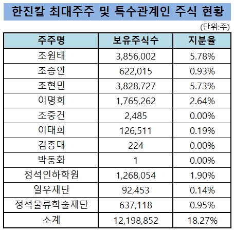 조원태 및 특수관계인 지분율 18.74→18.27%