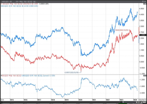 독일과 미국의 10년물 금리 스프레드는 최근 -180bp까지 확대됐으나 2022년 평균치와 유사한 수준이다. 2019년 -270bp에 비하면 크게 낮기도 하다.