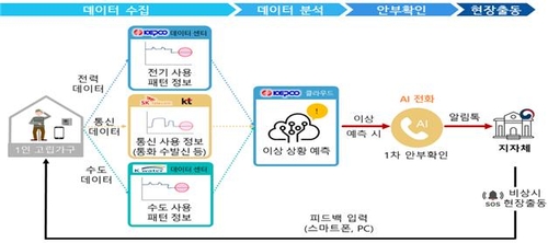 각 협력사는 전력(한전), 수도(수자원공사), 통신(SK텔레콤)의 사용량 이상내역을 서버로 전송하고 한전은 데이터를 취합·분석하여 최종 이상여부를 판단하며, 이상고객으로 판단시 SK텔레콤이 AI전화로 안부확인 및 지자체 담당자에 메신저 전달[한국전력 제공]