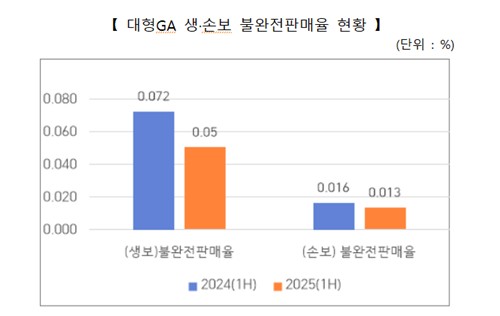 한국보험대리점협회는 19일 '2025년 상반기 경영공시 자료 분석 결과'를 통해 대형 GA 전체 불완전 판매율은 0.034%에서 0.028%로 0.006%포인트(p) 낮아졌다고 분석했다.