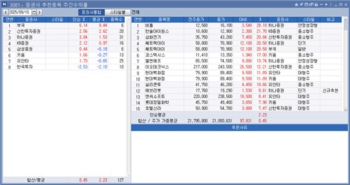 추천종목의 누적 등락률은 인포맥스 화면 '증권사 추천종목 현황(화면번호 3080)'을 통해 실시간으로 확인할 수 있다.