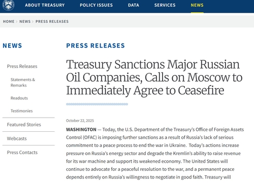 스콧 베선트 미 재무장관은 "이제는 살상을 멈추고 즉각적인 휴전을 해야 할 때"라며 "블라디미르 푸틴 러시아 대통령이 이 무의미한 전쟁을 끝내길 거부하고 있어 재무부는 크렘린의 전쟁 기계를 자금으로 지원하는 러시아 최대의 두 석유회사를 제재한다"고 밝혔다.