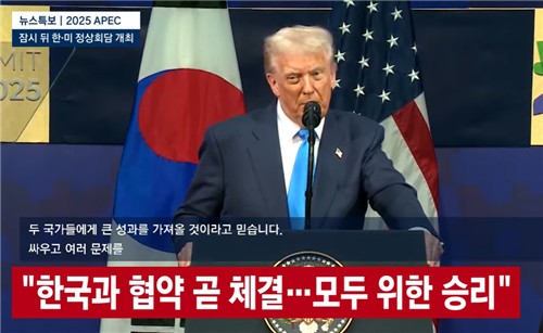(경주=연합인포맥스) 정지서 황남경 기자 = 아시아태평양경제협력체(APEC) 정상회의 참석차 방한한 도널드 트럼프 미국 대통령이 한미 동맹을 강조하고, 한국과의 무역협상을 조만간 마무리지을 것이라고 밝혔다.