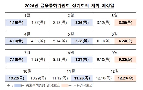 이 중 통화정책방향 결정회의는 1월15일(목), 2월26일(목), 4월10일(금), 5월28일(목), 7월16일(목), 8월27일(목), 10월22일(목), 11월26일(목) 등 총 여덟 번이다.