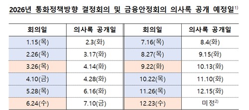 한은은 30일 2026년 금통위 정기회의 개최 및 의사록 공개 일정을 공표했다.