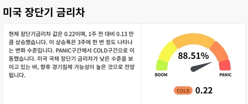 패닉-붐 지표의 하위 지수인 미국 장단기 금리차 값은 0.22로 일주일 전보다 0.13 만큼 상승했다. 이는 3주에 한 번 정도 나타나는 변화 수준으로 '패닉(PANIC)' 구간에서 콜드 구간으로 이동하고 있다.
