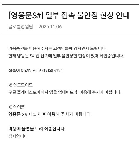 키움증권 측은 6일 밤 공지를 통해 "현재 영웅문S# 앱 접속에 일부 불안정한 현상이 있어 확인 중"이라며 "안드로이드 사용자는 앱 업데이트, 아이폰 사용자는 재설치를 부탁드린다"고 안내했다. 고객 문의에 "접속이 어려운 경우 영웅문S Global(글로벌) 앱을 이용해달라"고 답변했지만 해결이 원활하지 않아 이용자들의 불만은 가라앉지 않고 있다.