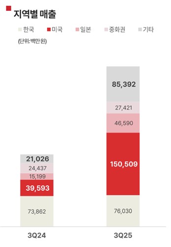 에이피알의 해외 매출 비중은 전체의 80%로, 전년 동기(58%) 대비 큰 폭 상승했다. 특히 미국 매출은 전년 동기 대비 280.1% 성장하며 실적 전반의 성장을 이끌었다.