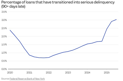 신규 연체 대출은 대출자가 최소 30일 이상 상환을 연체한 대출 잔액으로, 뉴욕 연방준비은행(연은)에 따르면 3분기 들어 5.3% 증가했다. 이는 지난 2014년 이후 가장 높은 연체율 수준이다.