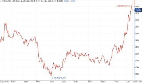 연합인포맥스 시가평가 매트릭스 일별추이(화면번호 4789)에 따르면 'A+' 공모 무보증 회사채 3년물 민평금리는 지난달 23일 3.431%에서 전날 3.748%로 31bp 급등했다.