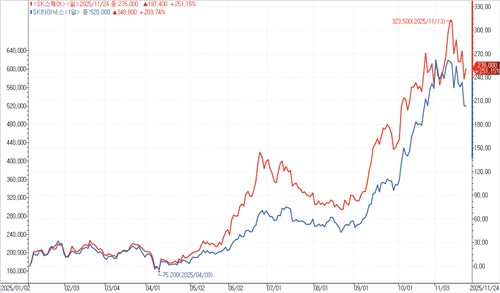 세계적인 인공지능(AI) 투자 확대로 메모리 호황이 이어지며 SK하이닉스 주가는 올해에만 200% 상승했다. SK스퀘어는 250% 넘게 오르며 상승 폭이 더욱 가팔랐는데, 'SK하이닉스를 할인된 가격에 살 수 있는' SK스퀘어에 투자자의 매수세가 더 많이 몰린 영향으로 풀이됐다.